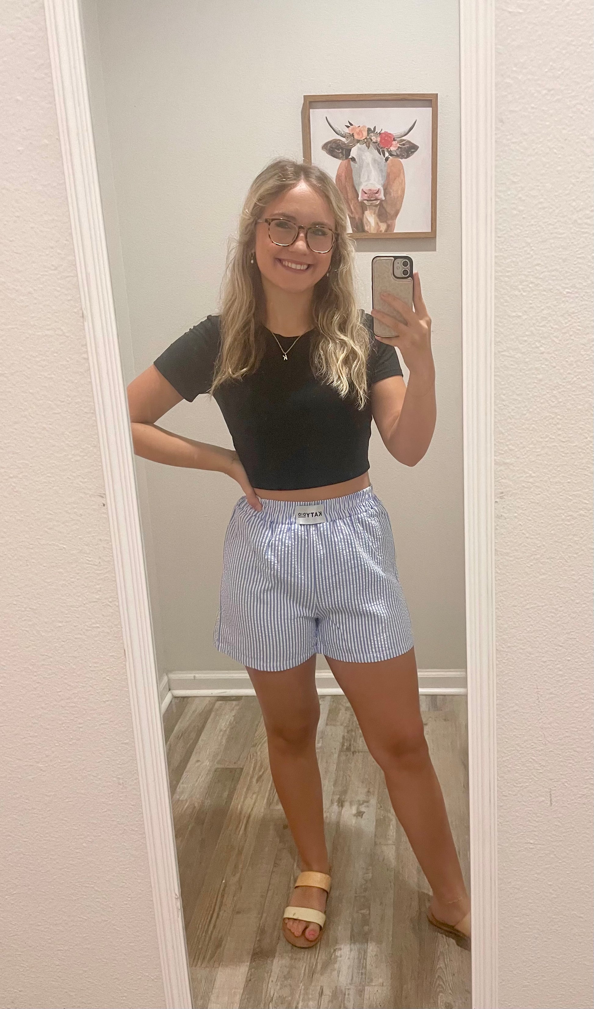 Perfectly designed for lounging or sleeping in style, these boxers feature bold, trendy blue stripes that are both fresh and flirty. With a comfy elastic waistband and soft, breathable fabric, they offer the perfect blend of comfort and cuteness. Trendy? Check. Comfy? Check. Chic? Absolutely!